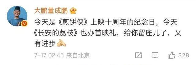 “今天是《煎饼侠》上映十周年的挂牵日,今天《长安的荔枝》也办首映礼,给你留座儿了,又有罕见。” 7 月 17 日凌晨 2 点多,大鹏在好友赵超逸的微博驳斥区留住这么一段话。