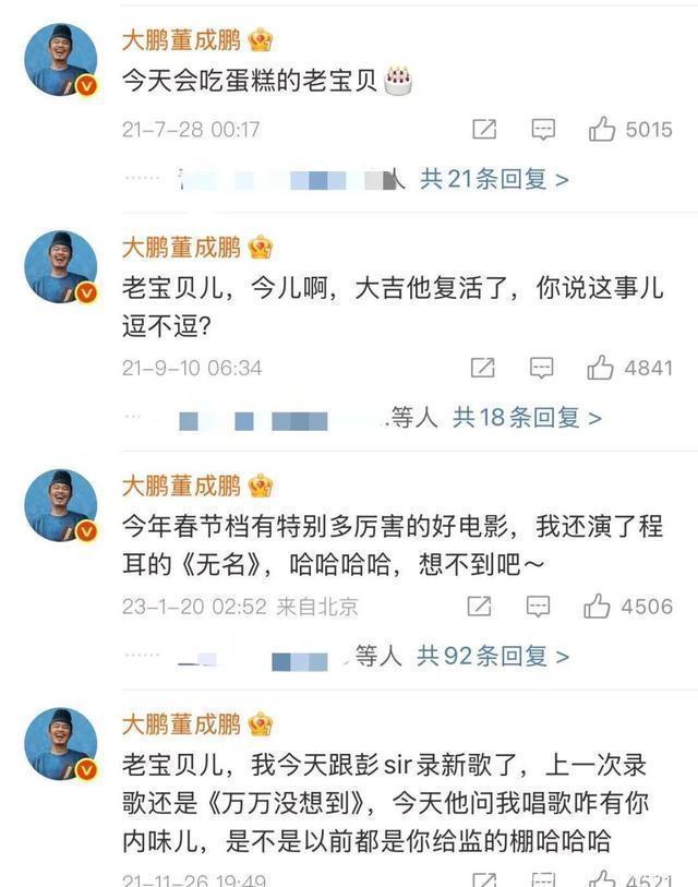 厚交离世,念念念从未罢手 2021 年 2 月 3 日,赵超逸照旧离开了这个全国,普遍东说念主为之缅怀。大鹏更是难以吸收这个事实,他在微博上发文吊问,字里行间齐是对知友的不舍和念念念。从那以后,大鹏养成了一个习气,不管生存中发生了什么事,他齐会在赵超逸的微博下留言,共享我方的喜怒无常。 他会在新电影开机时告诉赵超逸:“老宝贝儿,新电影开机了,但愿一切得手。”会在首映礼截至后说:“老宝贝儿,今天整的挺好,没给你丢丑。”也会在除夜夜,简便地写下一句:“老宝贝儿,除夜了,想你。”这些留言,就像一封封跨越存一火的信件,诉说着他们之间深厚的情态。
